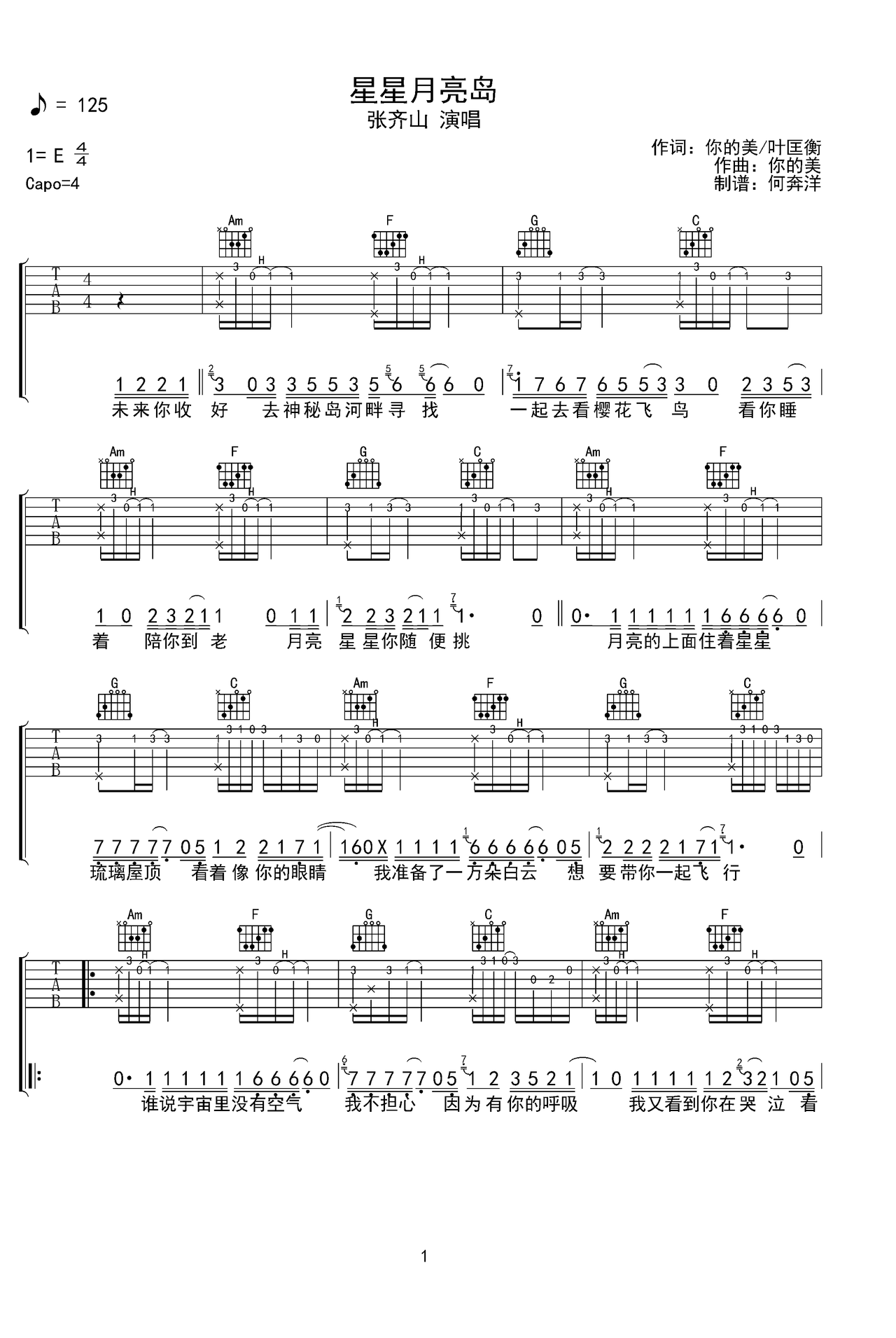 张齐山《星星月亮岛》C调原版吉他谱你的美/叶匡衡弹唱谱星星月亮岛名人名曲张齐山E大调你的美
