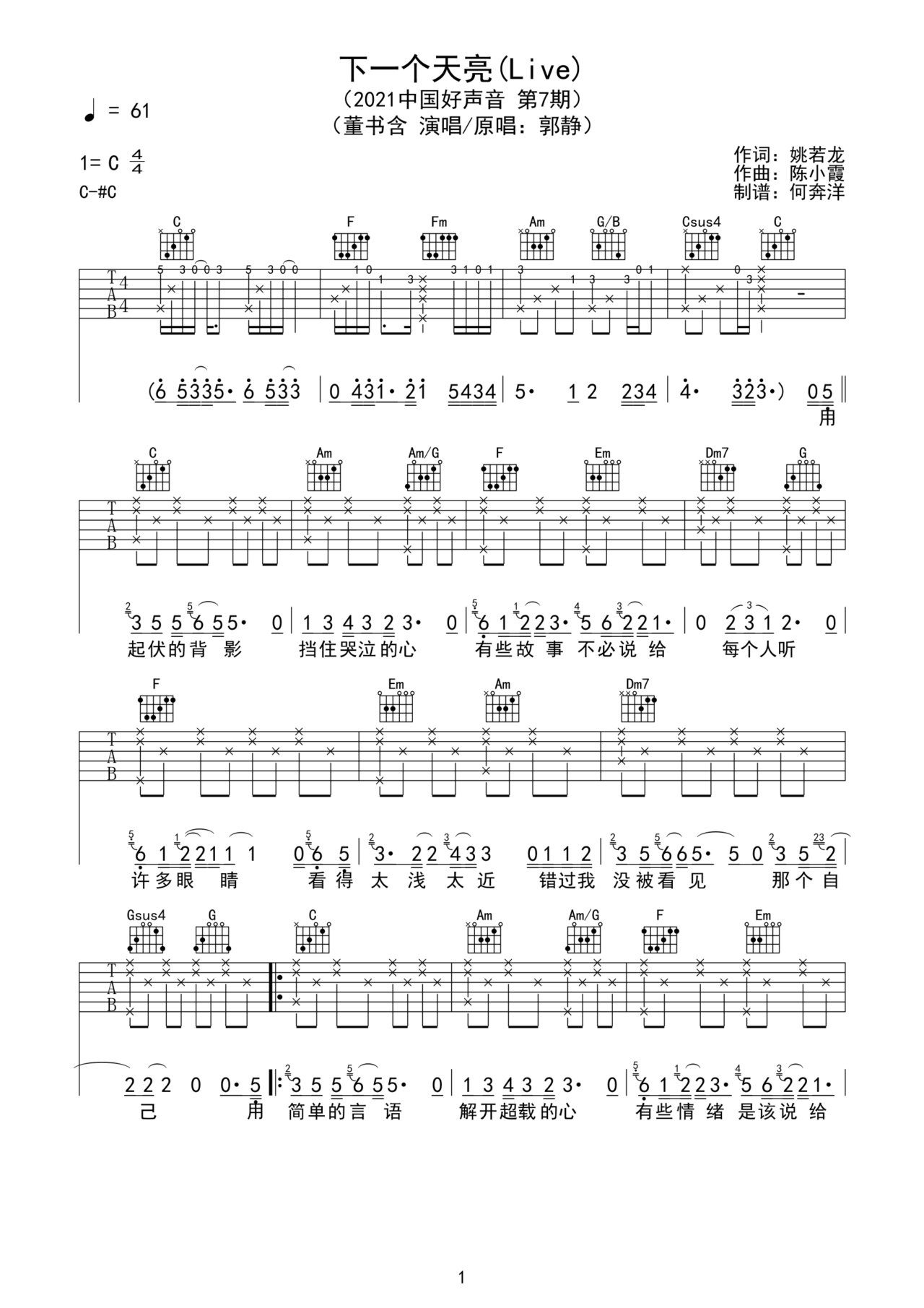 董书含《下一个天亮》现场版弹唱谱下一个天亮原曲第三遍副歌转#C调,这里未编配转调部分名人名曲董书含C调