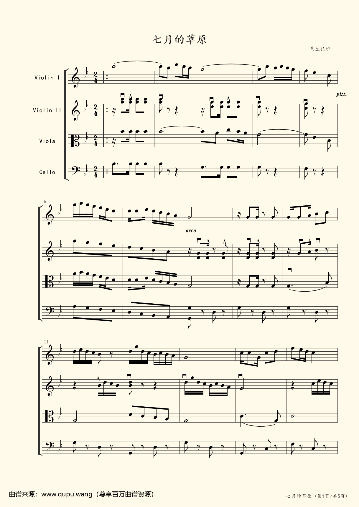 七月的草原(弦乐四重奏),小提琴谱,乌兰托娅,钢琴谱,免费下载,钢琴网,iPad,五线谱,乐谱,曲谱,ove