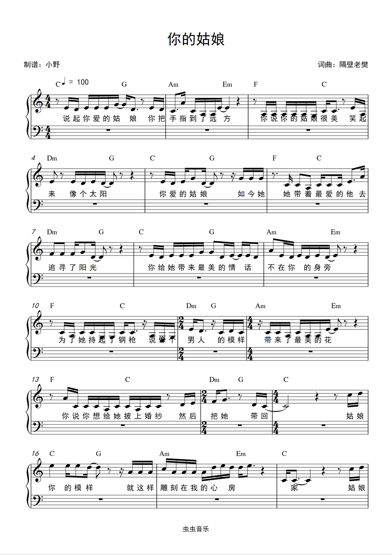 你的姑娘(和弦弹唱版)隔壁老樊弹唱谱你的姑娘华语男歌手隔壁老樊C调隔壁老樊
