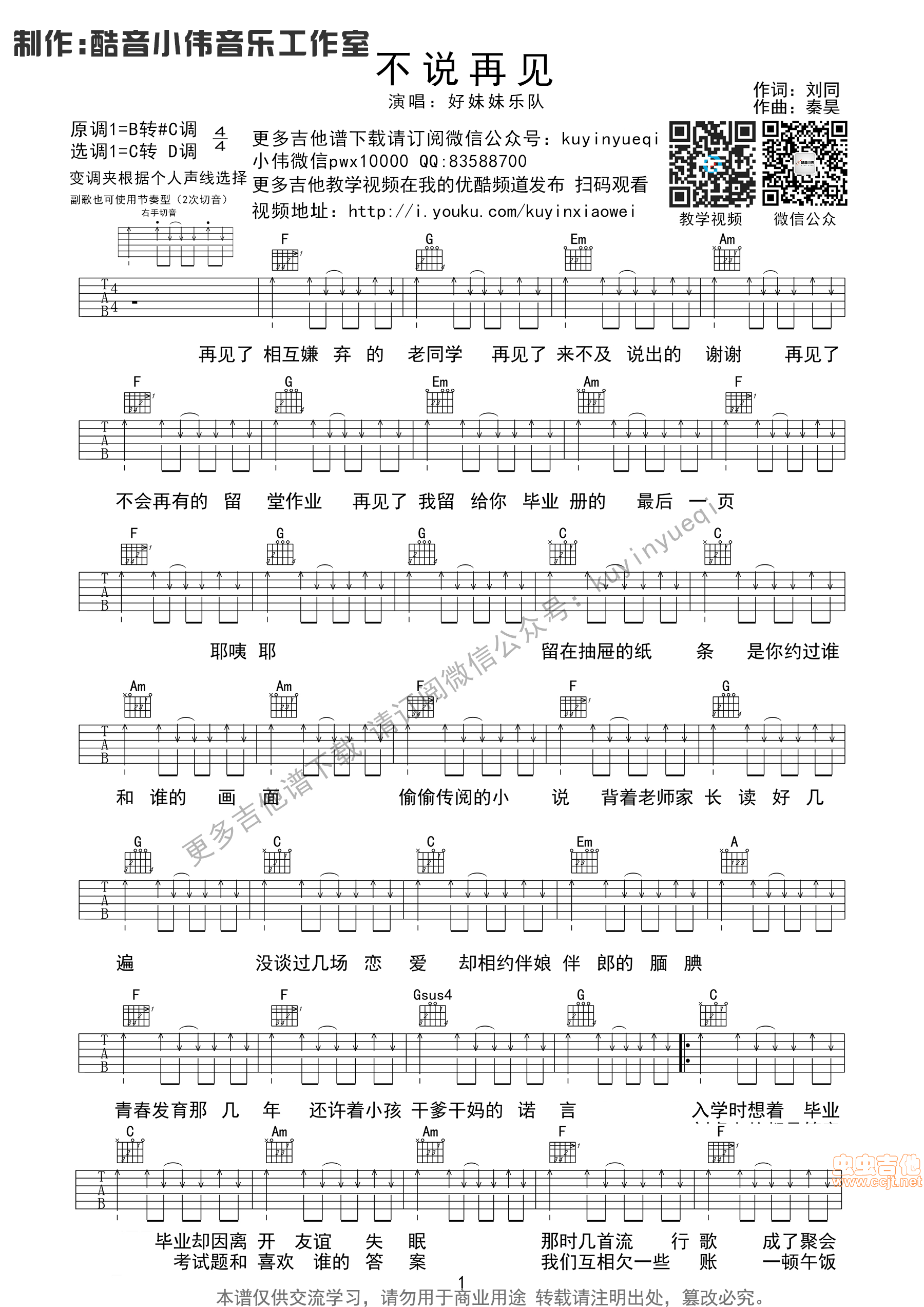 《不说再见》好妹妹C调简单完美版吉他谱弹唱谱不说再见更多小伟编配的吉他曲谱下载请订阅微信公众号kuyinyueqi 更多的吉他视频教学在我的优酷频道"酷音小伟吉他"第一时间更新http://i.youku.com/kuyinxiaowei(记得订阅哦!) 音乐交流 小伟微信pwx10000 QQ:83588700 新浪微博@酷音小伟华语乐队组合好妹妹C调