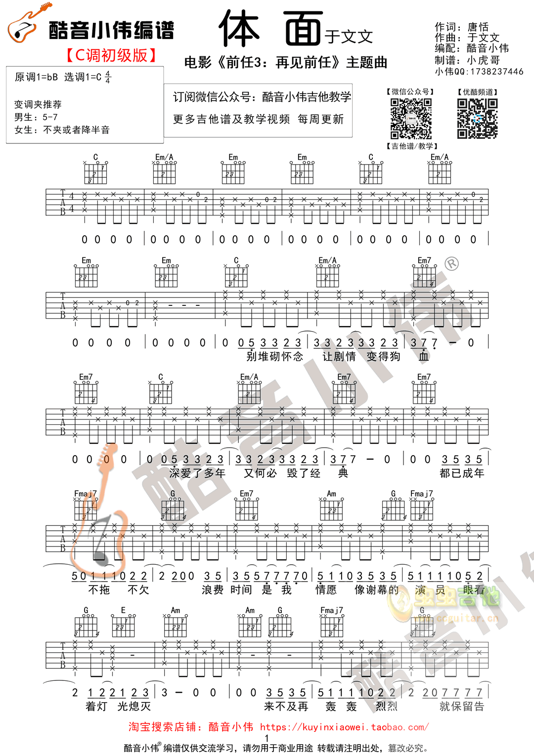 于文文《体面》吉他谱C调简单版(酷音小伟编谱)弹唱谱体面更多吉他谱下载地址 微信公众号:酷音小伟吉他教学 吉他教学视频每周更新,优酷频道http://i.youku.com/i/UMzE2NTY1MDc2MA==?spm=a2h0k.8191407.0.0 淘宝店铺:https://kuyinxiaowei.taobao.com华语女歌手于文文C调