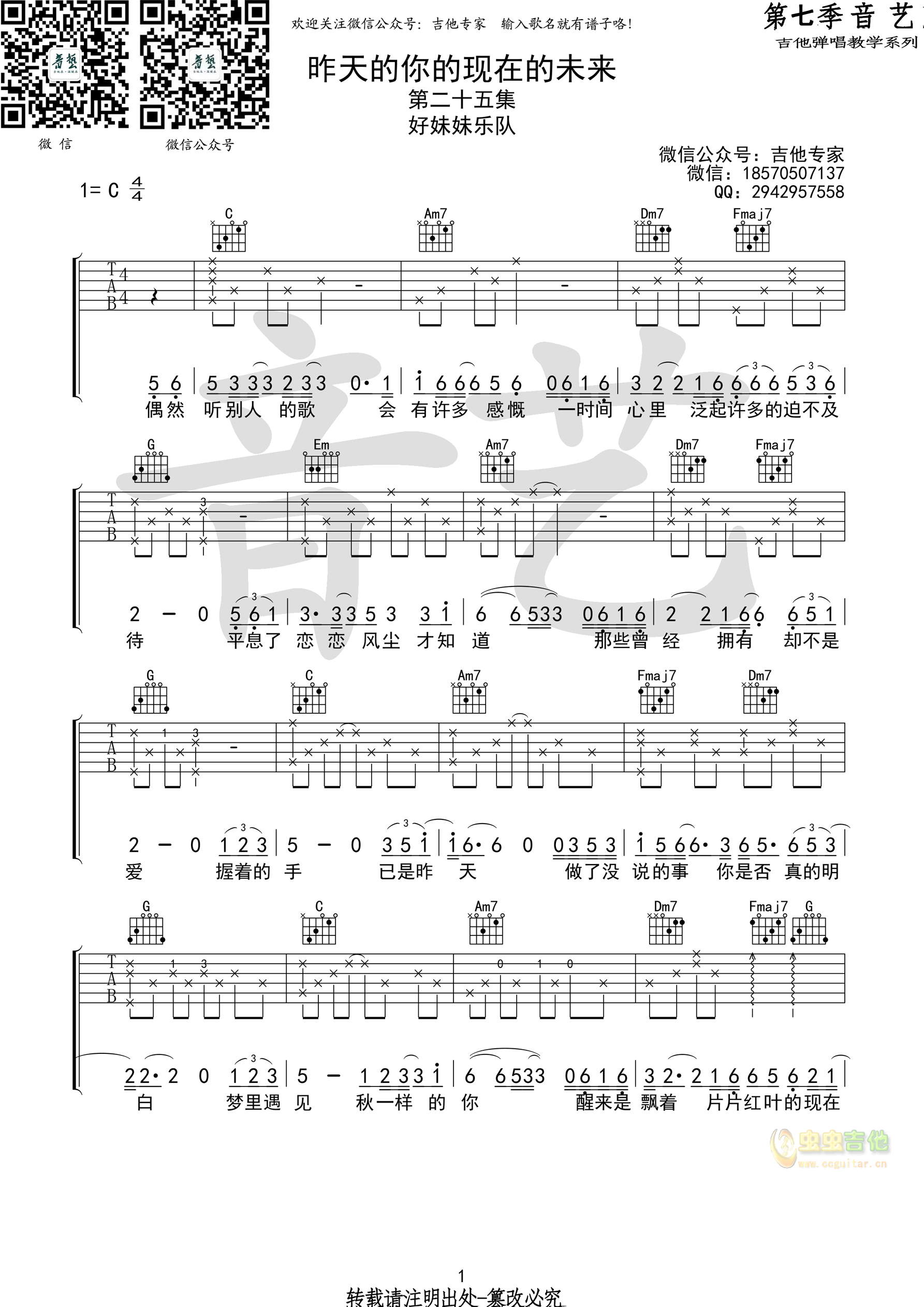昨天的你的现在的未来弹唱谱昨天的你的现在的未来微信公众号:吉他专家 直接输入歌名就能得到谱子啦! QQ:2942957558 淘宝店铺:音艺艺术 链接:https://shop120252028.taobao.com/华语乐队组合好妹妹C调