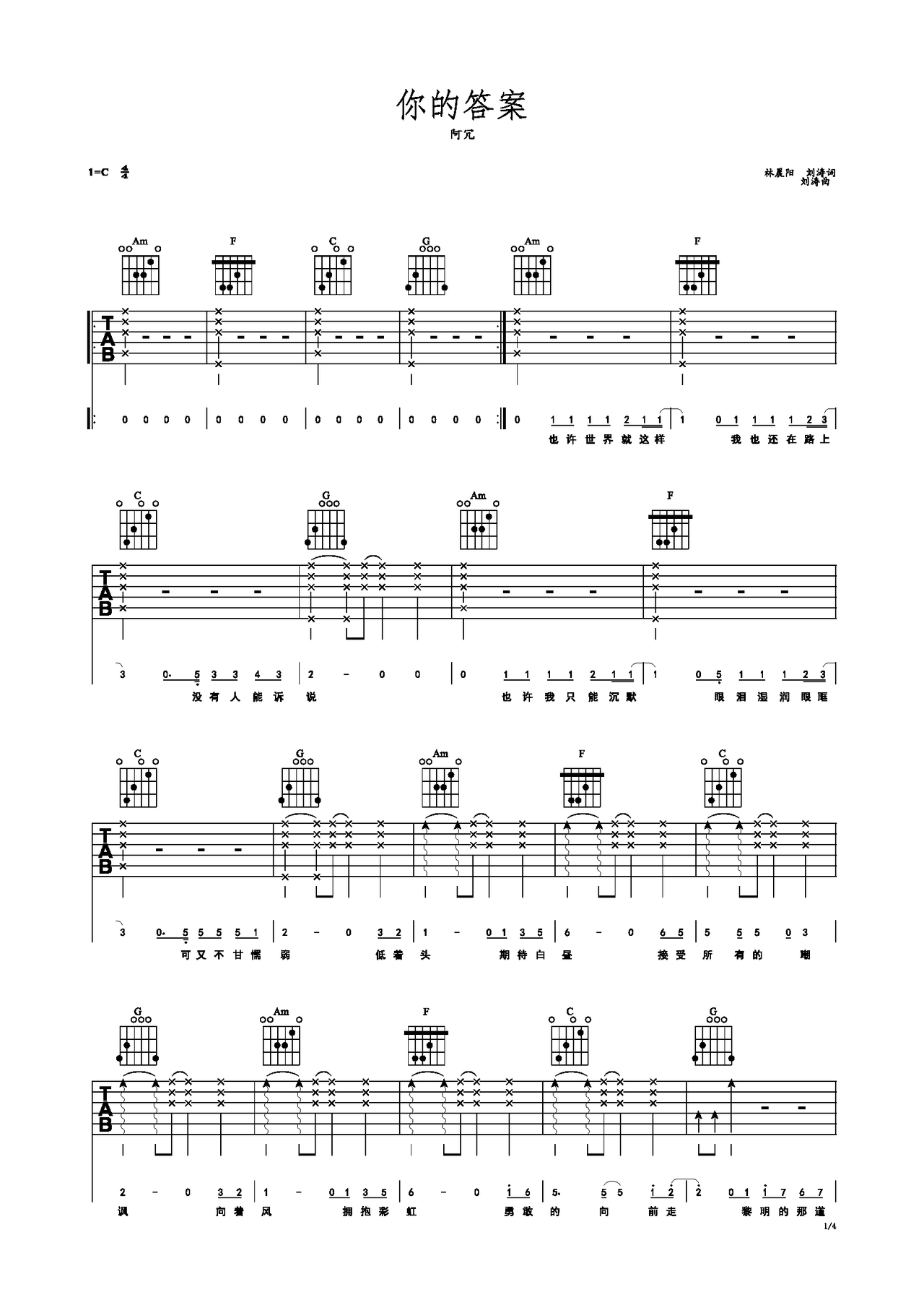 你的答案 C调 阿冗弹唱谱你的答案华语男歌手阿冗C调刘涛