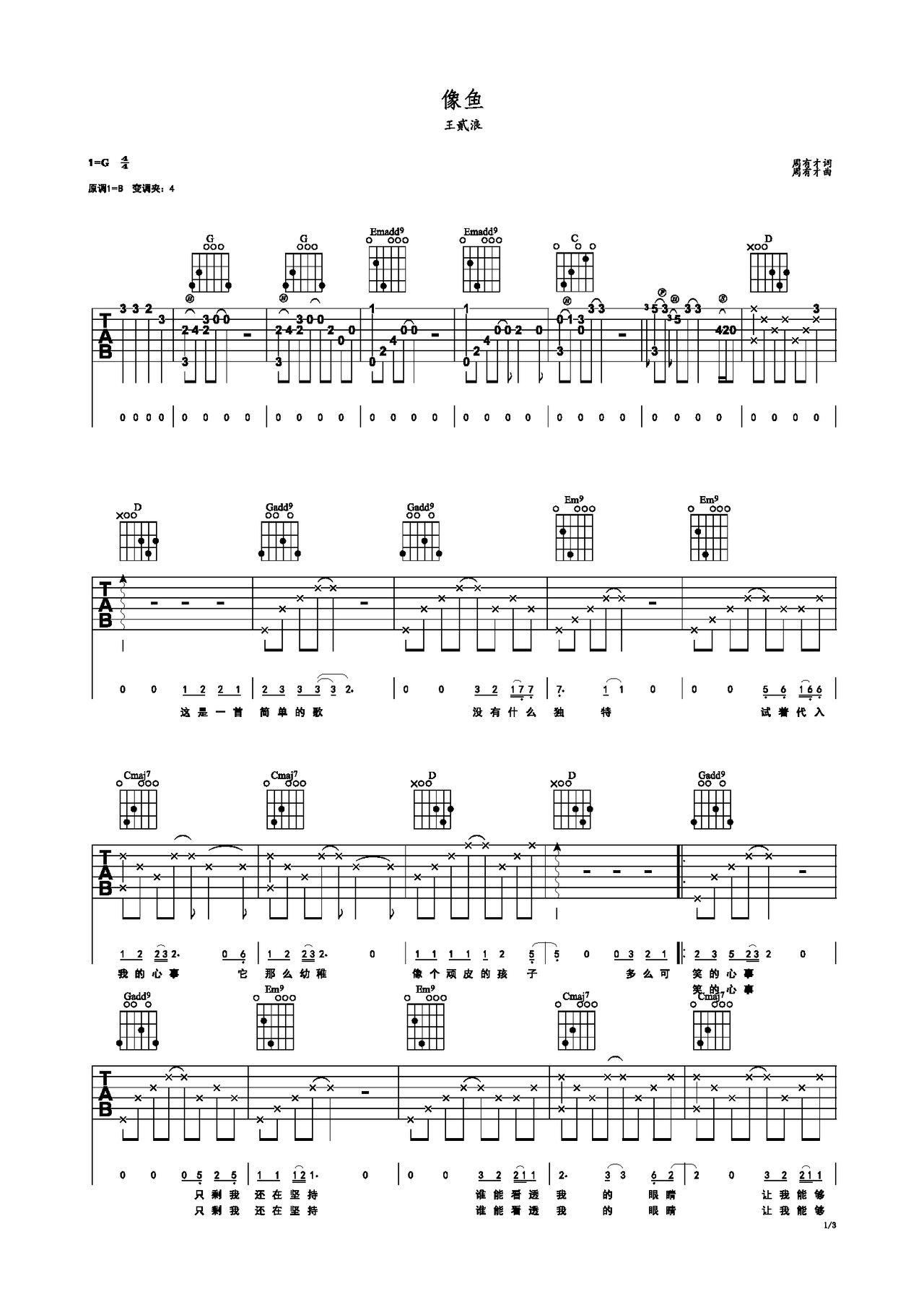 曲谱吉他网吉他爱好者的天堂,提供专业全面的像鱼吉他谱,下载像鱼吉他谱就来曲谱吉他网