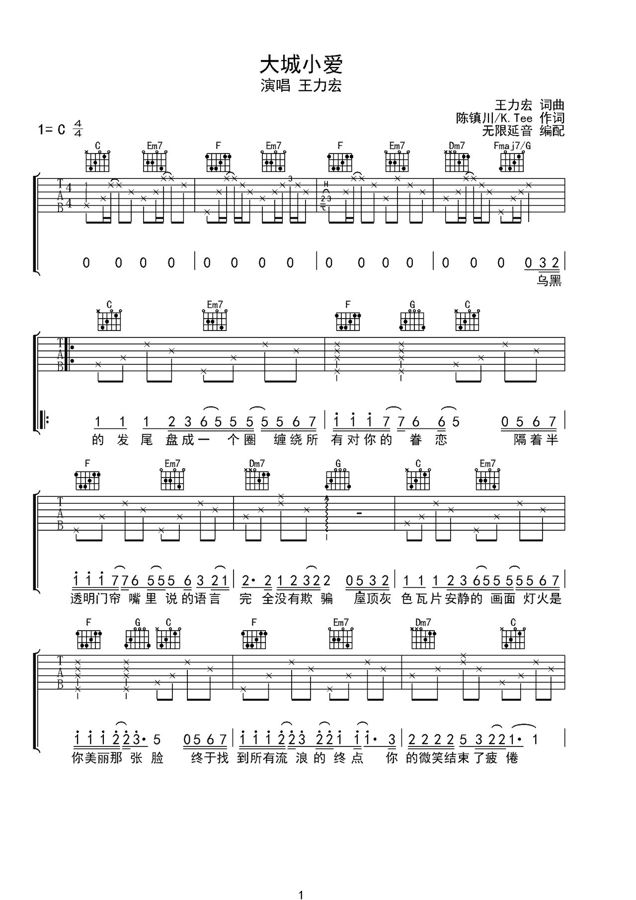 王力宏 大城小爱 吉他谱 C调指法弹唱谱大城小爱华语男歌手王力宏C调