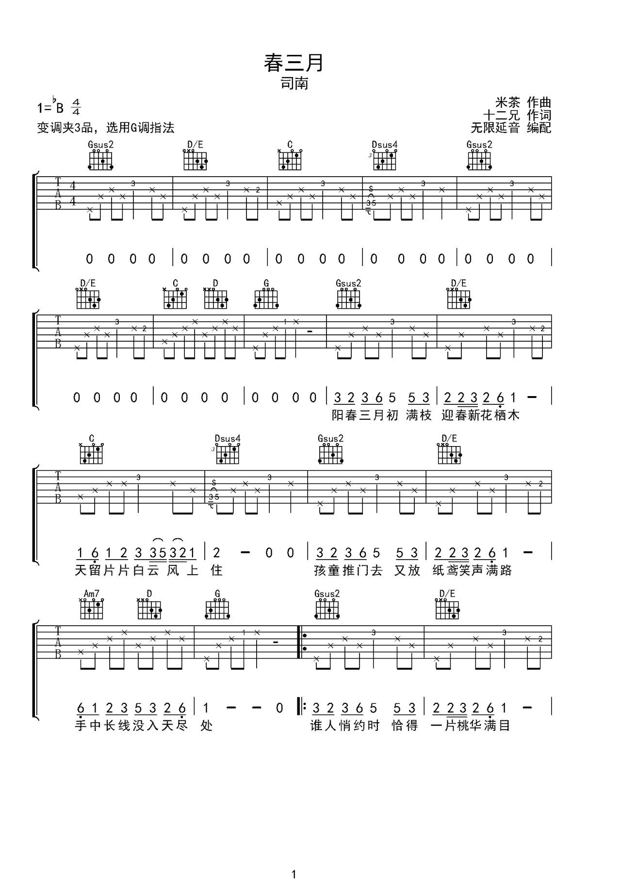 司南 春三月 吉他谱 C调指法弹唱谱春三月名人名曲司南Bb调