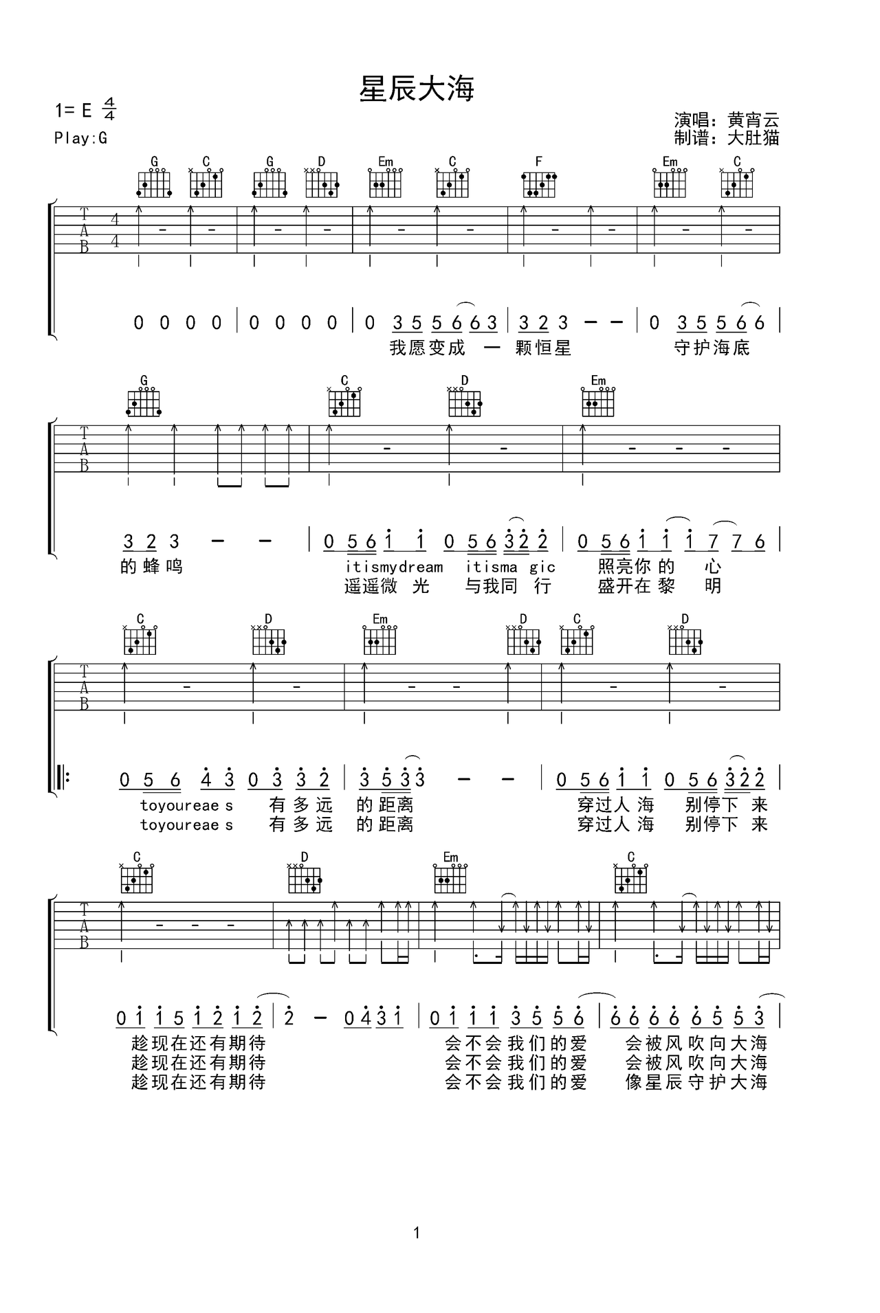 星辰大海-G调原版-黄霄云弹唱谱星辰大海G调原版,更多新歌好谱持续更新中,感谢支持与关注。名人名曲黄霄云G调