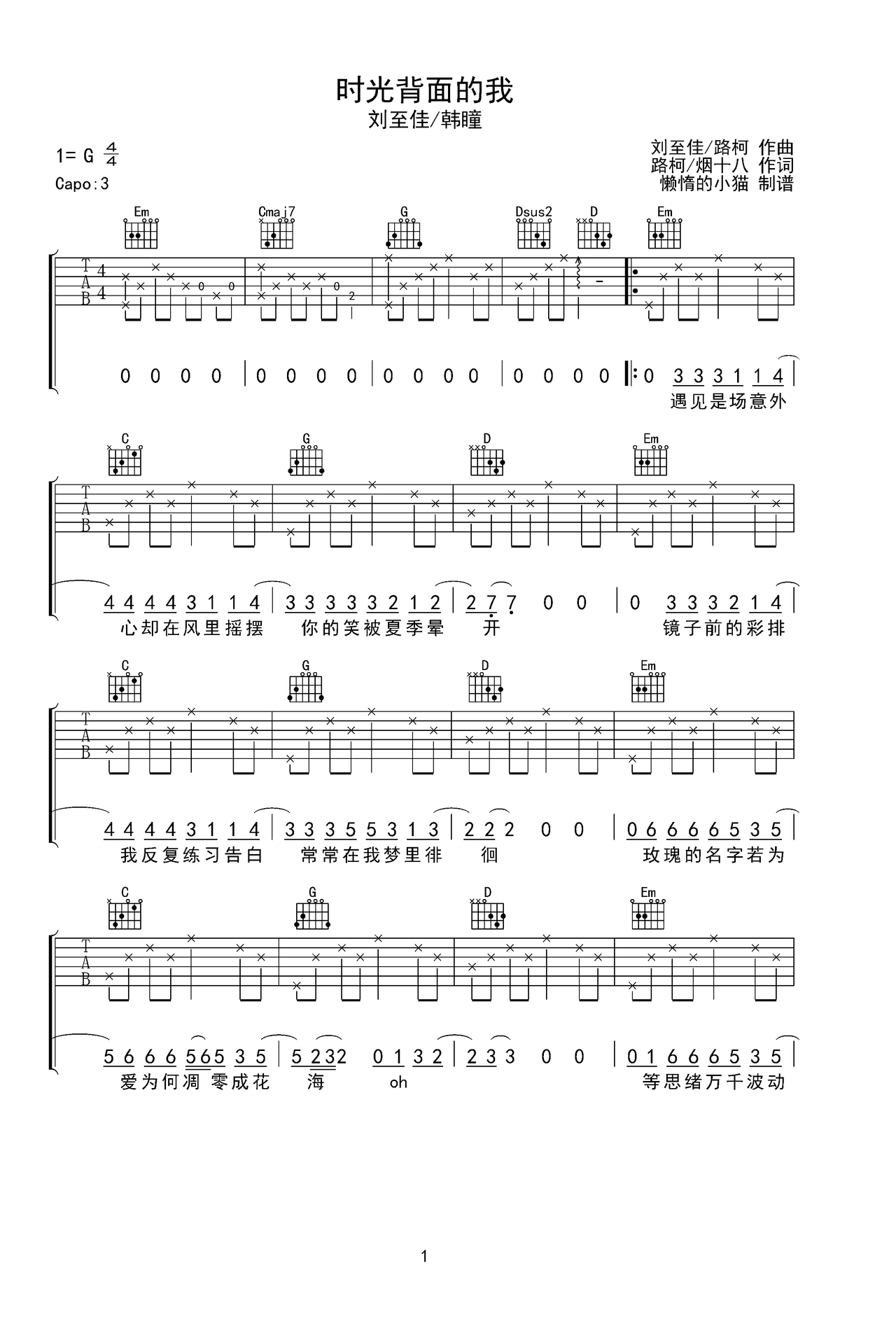 时光背面的我路柯/烟十八弹唱谱时光背面的我名人名曲刘至佳/韩瞳G调刘至佳/路柯