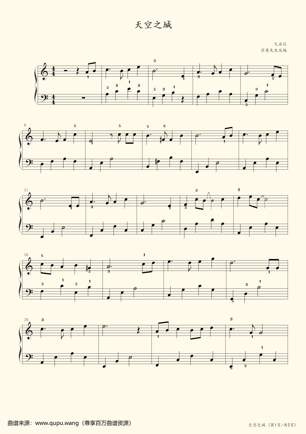 《天空之城,钢琴谱》久石让(五线谱 钢琴曲 指法)