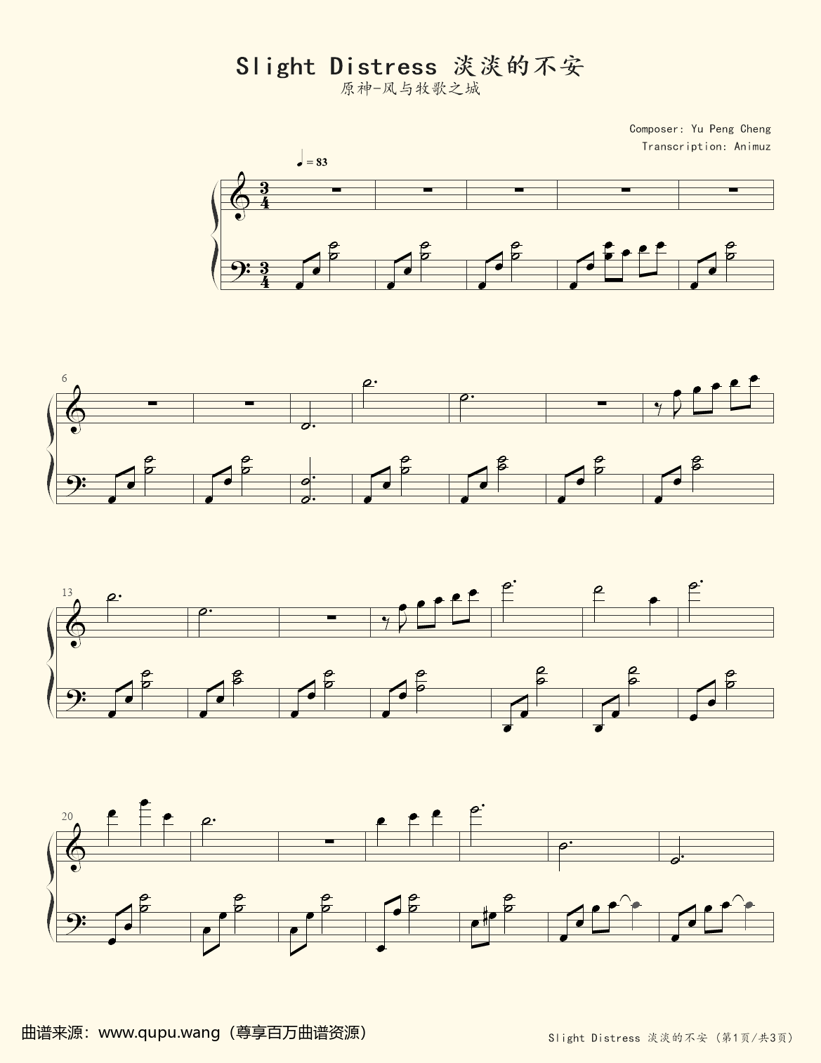《原神-风与牧歌之城-Slight Distress 淡淡的不安,钢琴谱》陈致逸 HOYO-MiX(五线谱 钢琴曲 指法)