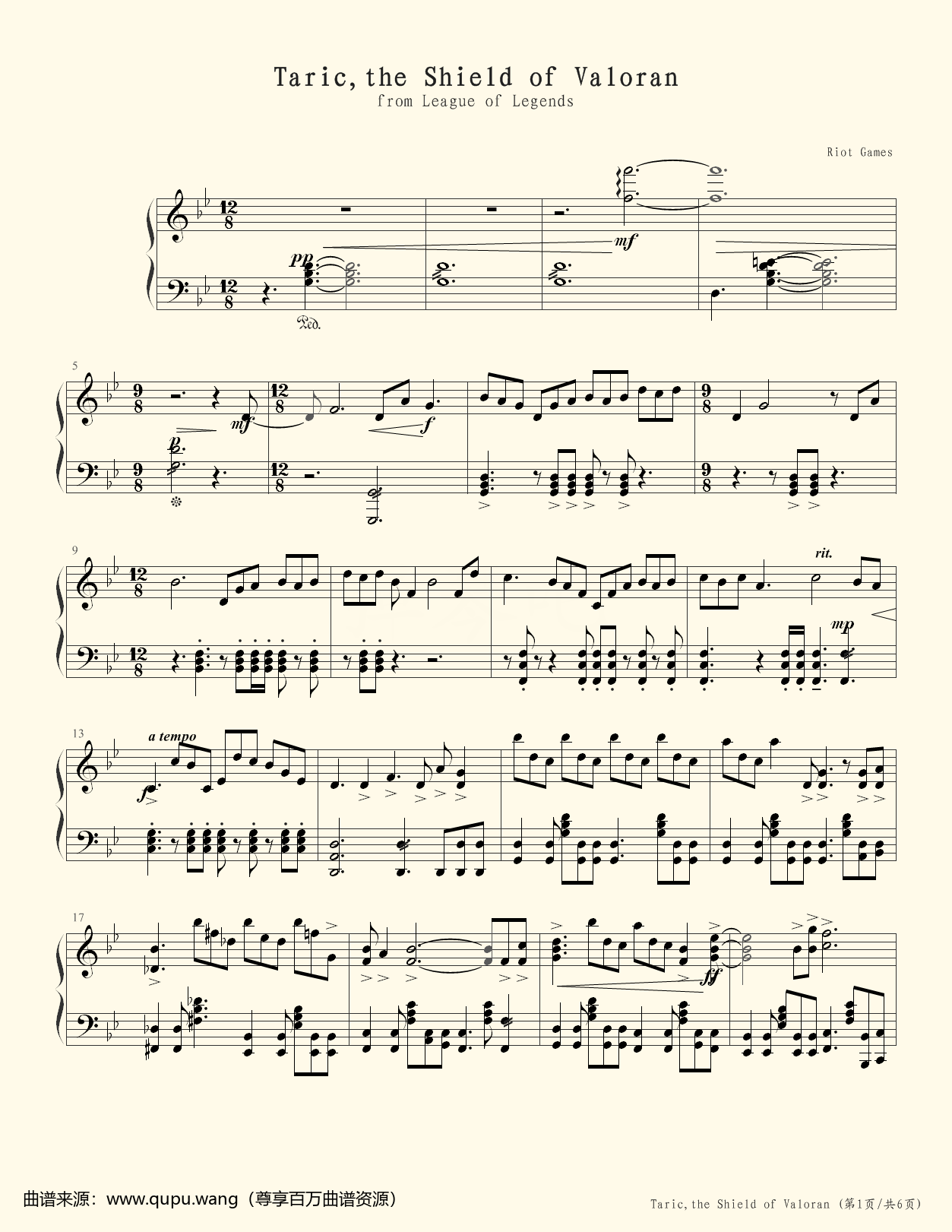 《Taric,the Shield of Valoran 英雄联盟瓦洛兰之盾 塔里克主题曲,钢琴谱》Riot Games(五线谱 钢琴曲 指法)