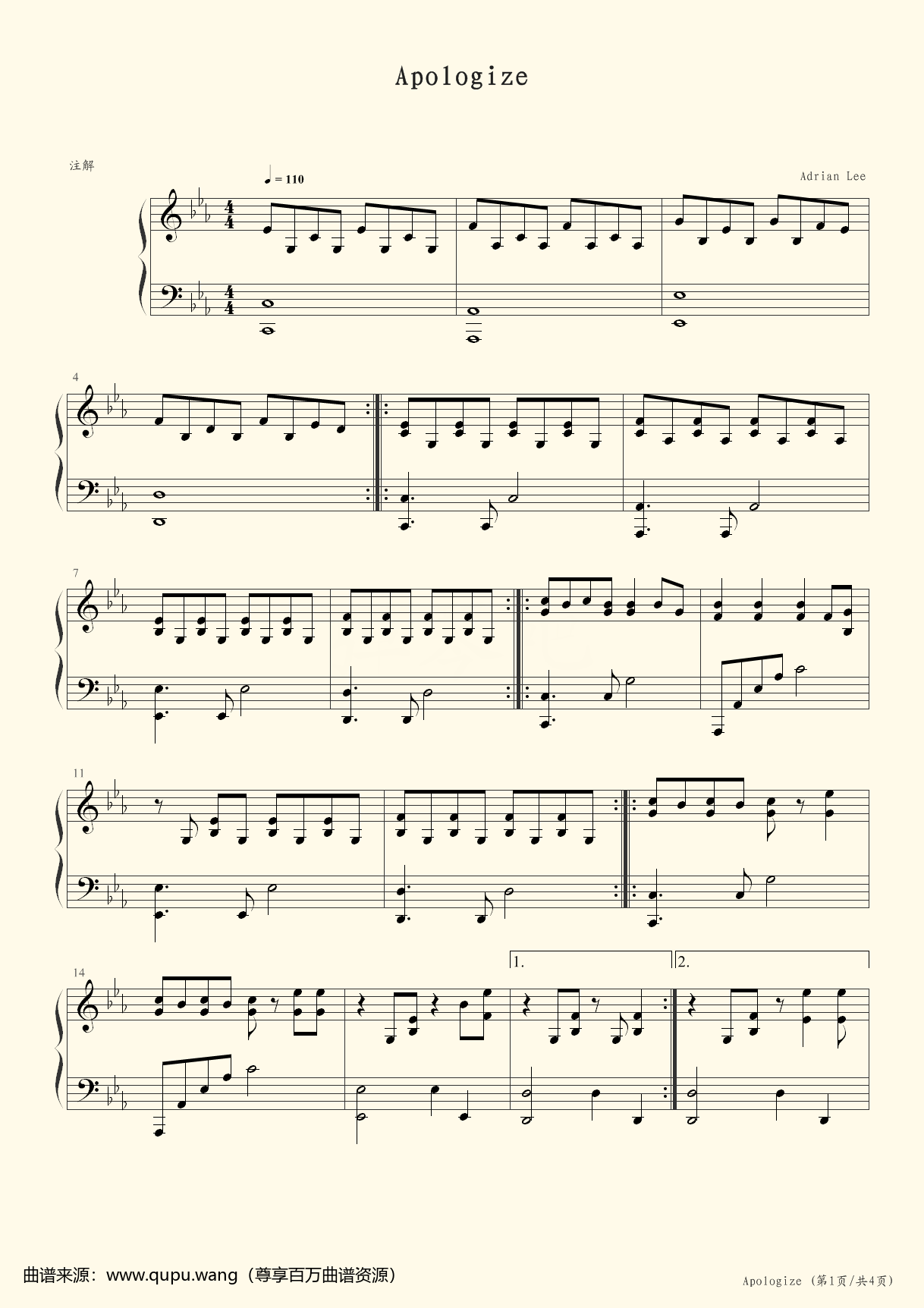 不一样的APOLOGIZE,钢琴谱,APOLOGIZE,钢琴谱,免费下载,钢琴网,iPad,五线谱,乐谱,曲谱,ove