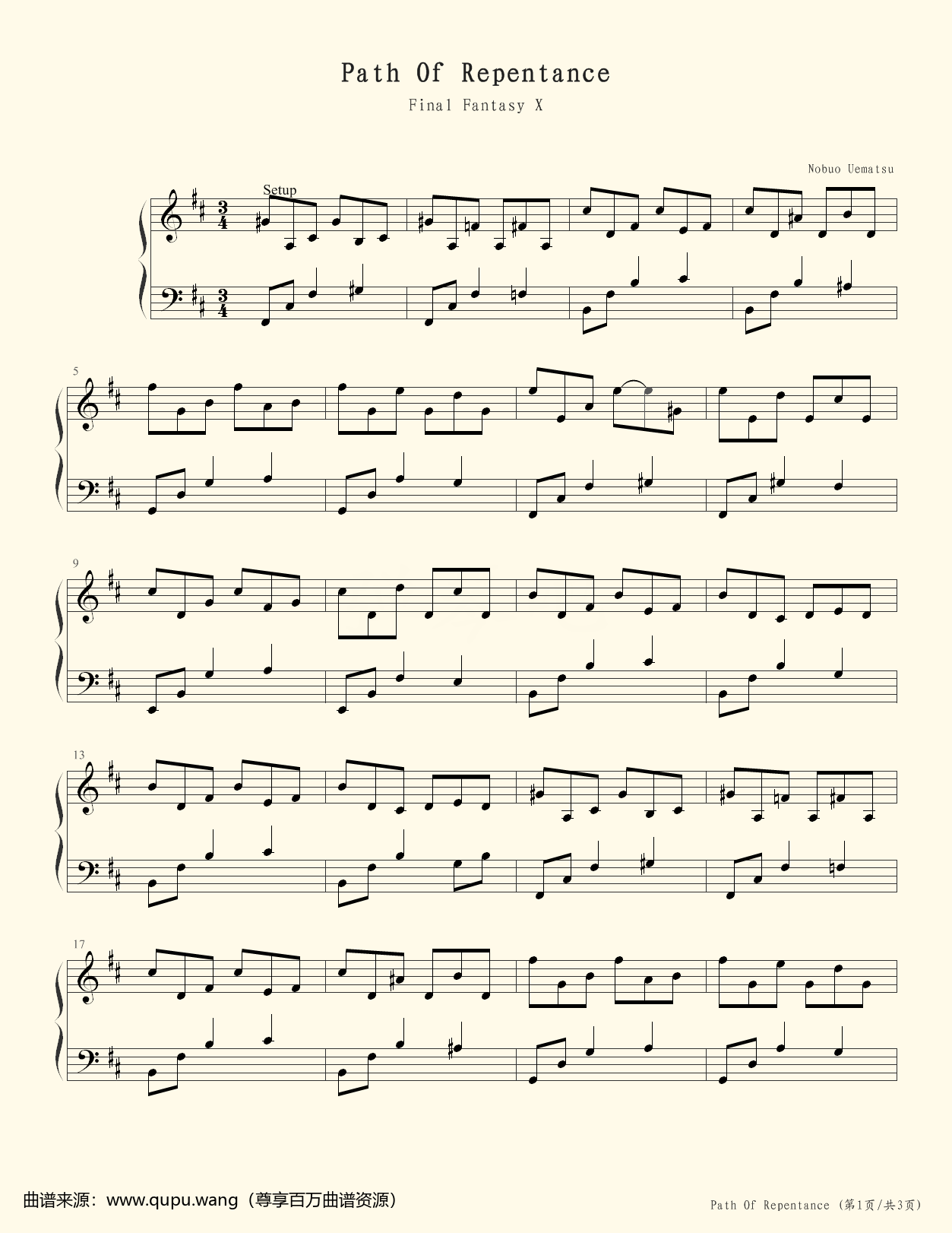 《最终幻想 10 (Final Fantasy X,钢琴谱》 - Path Of Repentance,植松伸夫 (Nobuo Uematsu)(五线谱 钢琴曲 指法)