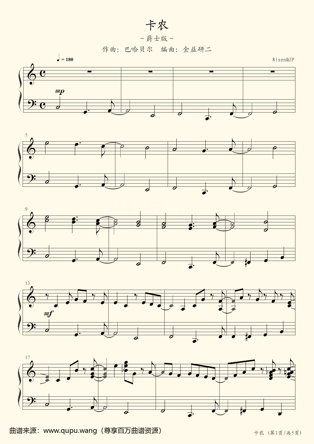 《卡农—爵士,钢琴谱》编曲:金益研三(五线谱 钢琴曲 指法)
