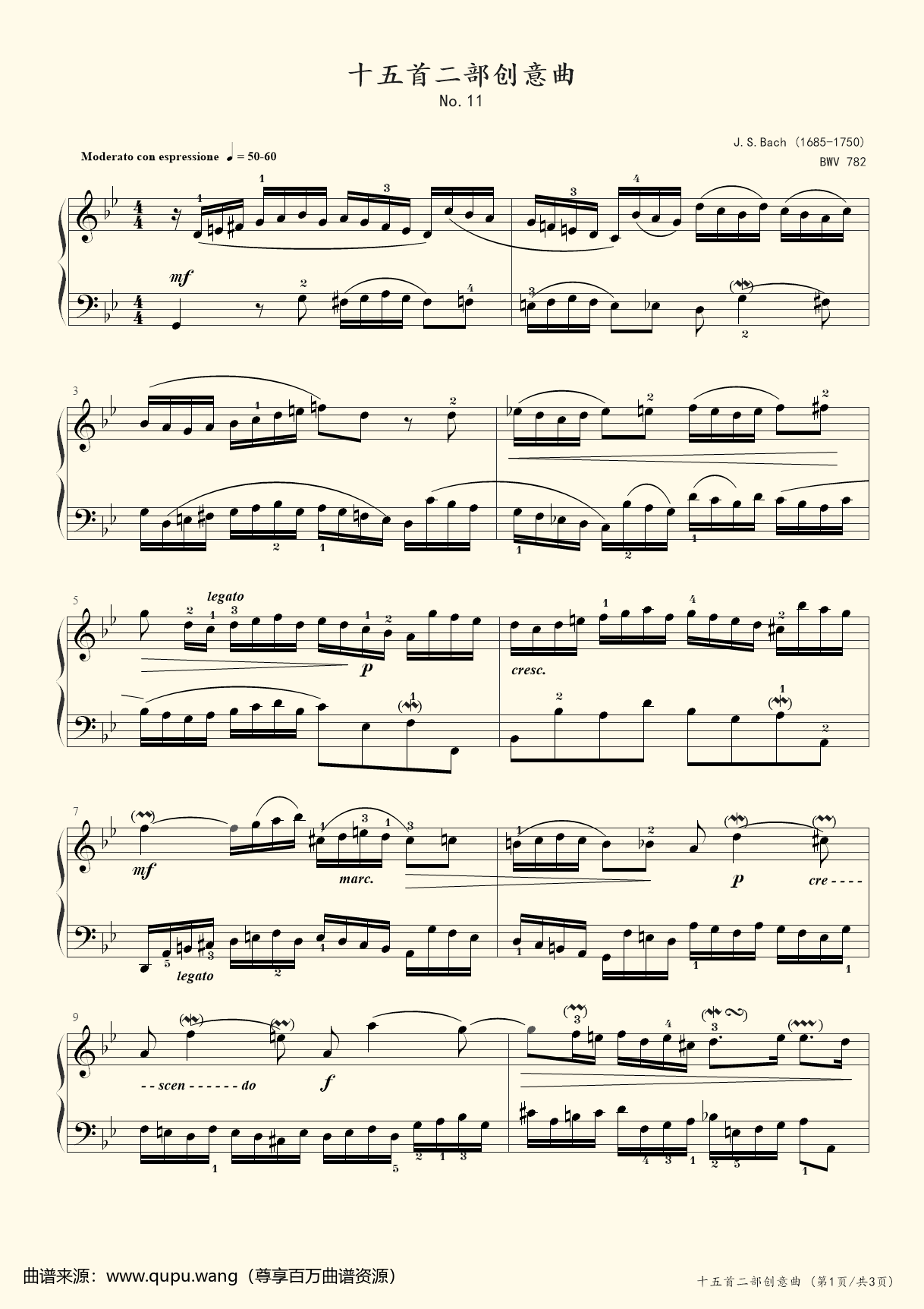 《二部创意曲 Inventions NO.11,钢琴谱》Bach.巴赫,J.S.Bach.巴赫|曲谱网|钢琴谱|吉他谱|钢琴曲|乐谱|五线谱|高清免费下载|蛐蛐钢琴网