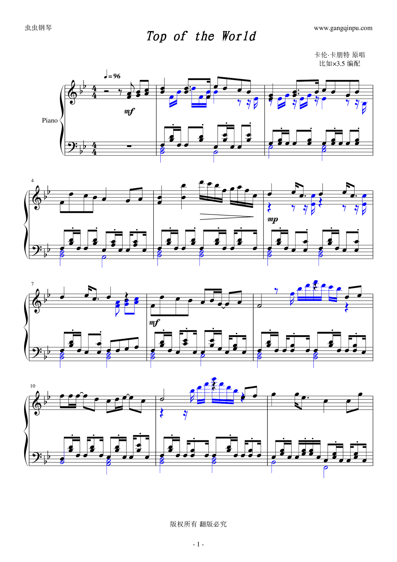 Top of the WorldRichard Carpenter/John Bettis独奏谱Top Of The World很经典的一首英文歌曲。我发现虫钢上竟然没有这首歌的谱,这么经典的歌怎能没谱呢?所以做了一份这首歌的钢琴版本,希望大家喜欢。