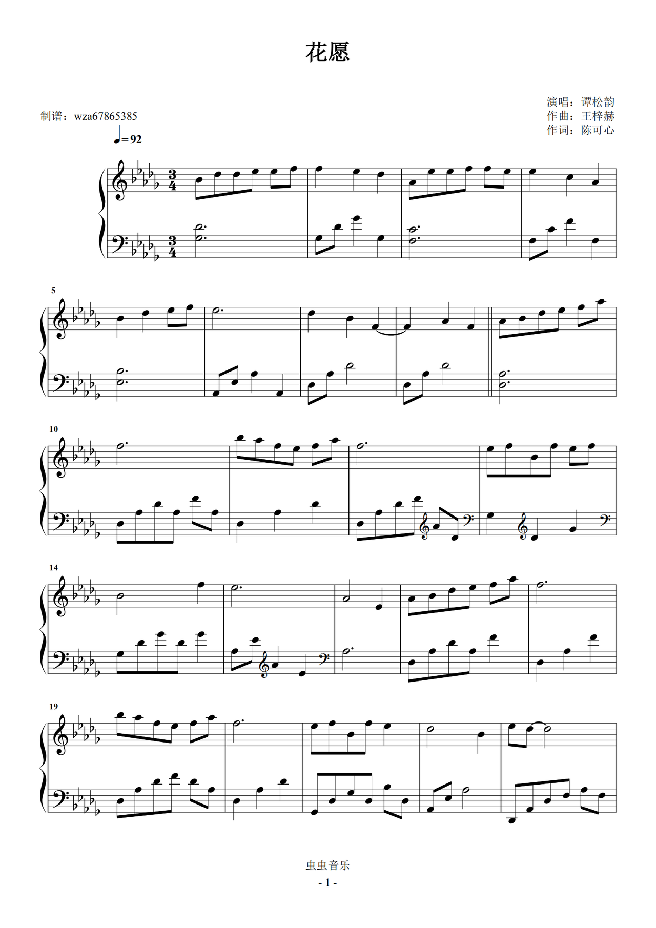 曲谱钢琴网第一钢琴谱门户,提供专业全面的花愿琴谱,下载谭松韵的花愿钢琴谱就来曲谱音乐网