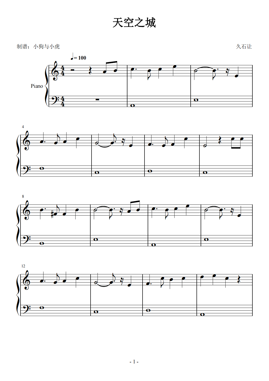 天空之城 C调 简易版宫崎骏独奏谱君をのせて需要其他的调的《天空之城》,可以联系我名人名曲久石让 (ひさいし じょう)C调久石让 (ひさいし じょう)